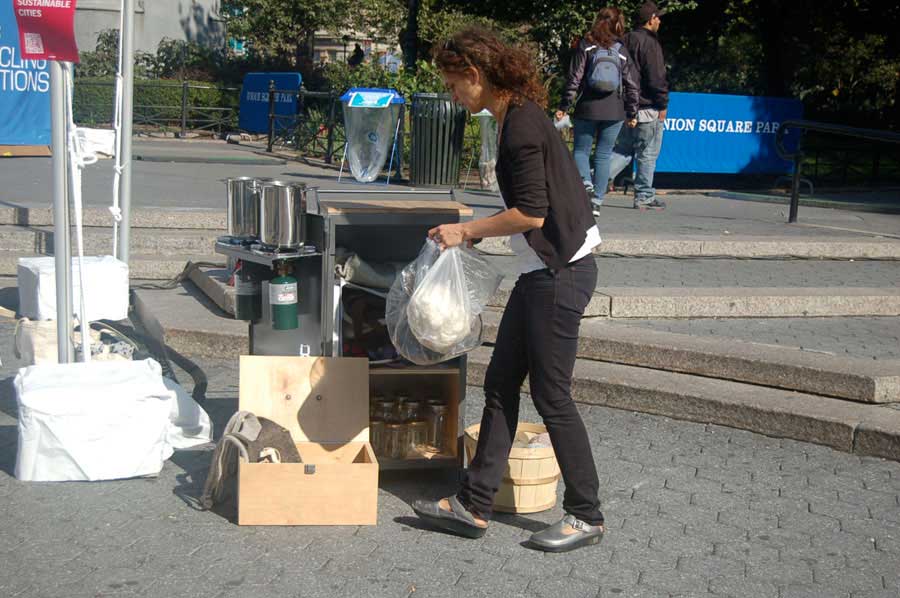 The Textile Lab visited the New Green City event sponsored by GrowNYC  Union Square. We parked next to the City Atlas crew, and made dyes with eucalyptus and cabbage from the greenmarket. We met Johanna from Herbal Garden of East NY. See her pictured below sporting her hand knitted coat and hat!