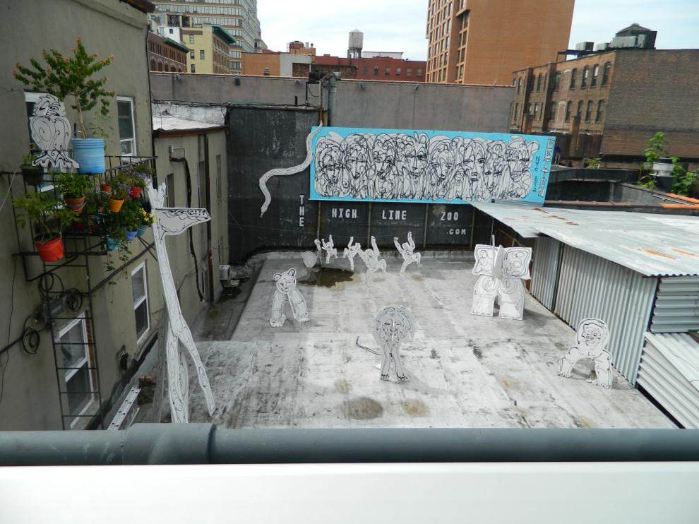 As a surprise as you are enjoying the beautiful views and landscape around you, The Highline Zoo is on the west side of the trail. An adjacent rooftop is home to 2D animals that come alive at night with lights, sounds, and video. The project is by artists Sun Bae, Jordan Betten, and Stuart Braunstein.