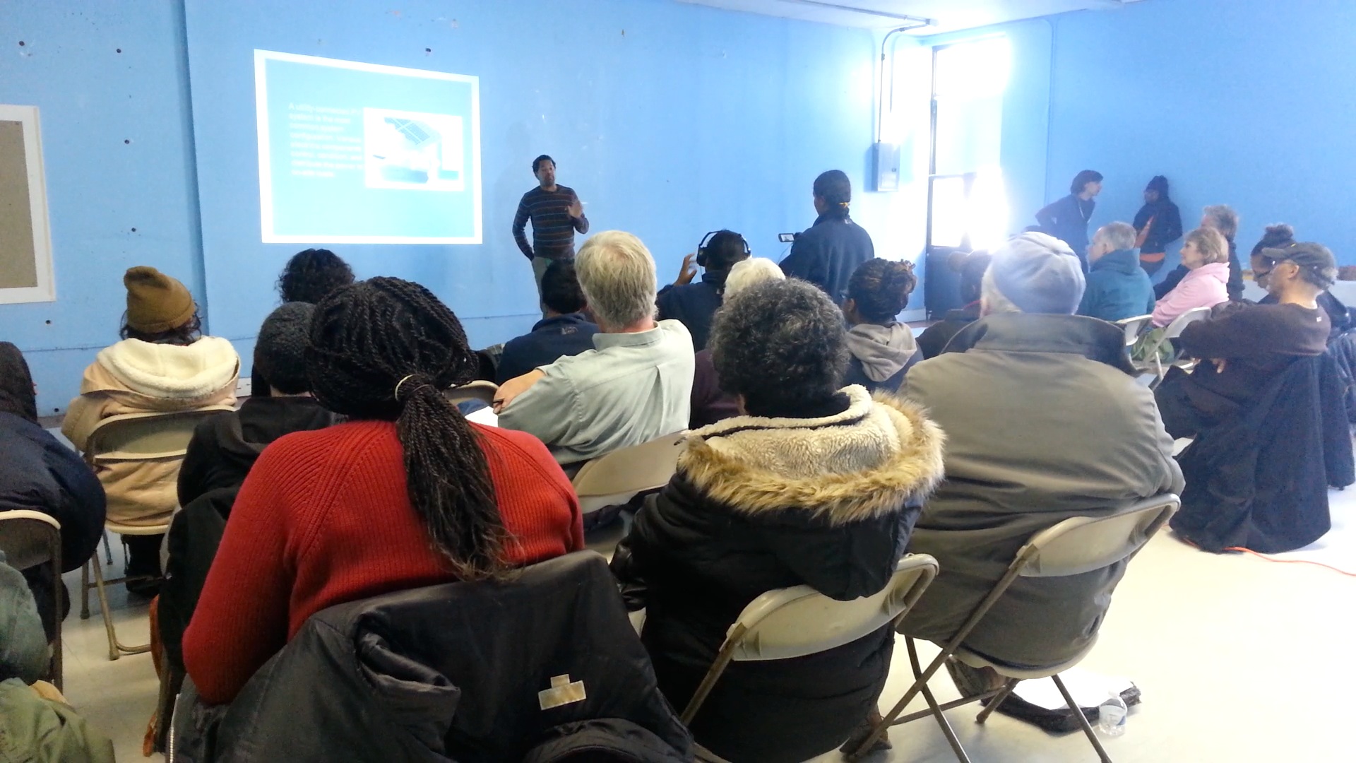 One of the dozens of residents in attendance asked where in a house or building would a solar battery go. When presenter David Gibbs said the battery usually goes in the basement, the crowd gasped, remembering the flooding Sandy caused in late October. But he added it could just as easily go in the attic or elsewhere.
