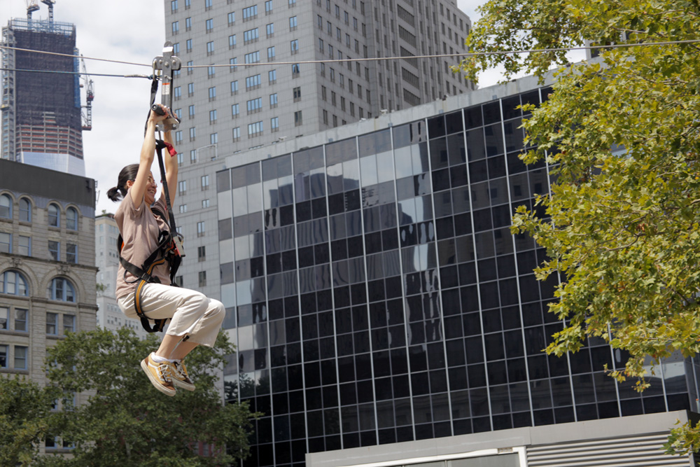 In NYC the initiative opens up nearly seven miles of street space for New Yorkers to play, climb, walk, bike, jump and dance. And this year, to ride a zipline.