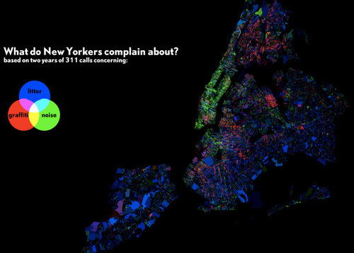 The 311 line is New York City’s dedicated government information service line, through which residents can access program information and also submit complaints and requests. Offenhuber divided the complaints into three types: litter (blue), graffiti (red), and noise (green), and as the map’s key indicates, areas of overlapping complaint can be identified by intermediate colors. (As elegant as it is for design purposes, displaying just three types of complaint probably misses the full spectrum of likely 311 calls.)